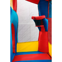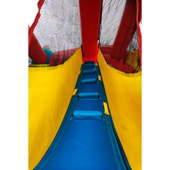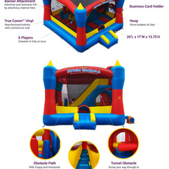 Large Bounce House: Bouncer contains a Pop-Up Obstacle lane, Obstacle Tunnel, Wide entry ramp, Climbing Wall (to slide), Slide (6' Drop), and Basketball Hoop (2 Soft Balls included), plus room to bounce! (20Lx17Wx13.75H)